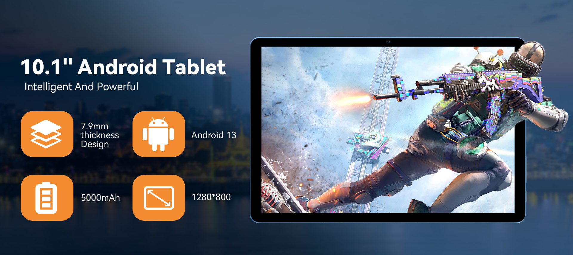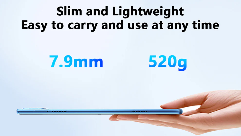 Det inbyggda 5000mAh-batteriet med hög kapacitet tillåter upp till 10 timmars videouppspelning och längre standbytid. Type-C-porten möjliggör snabb och bekväm laddning.