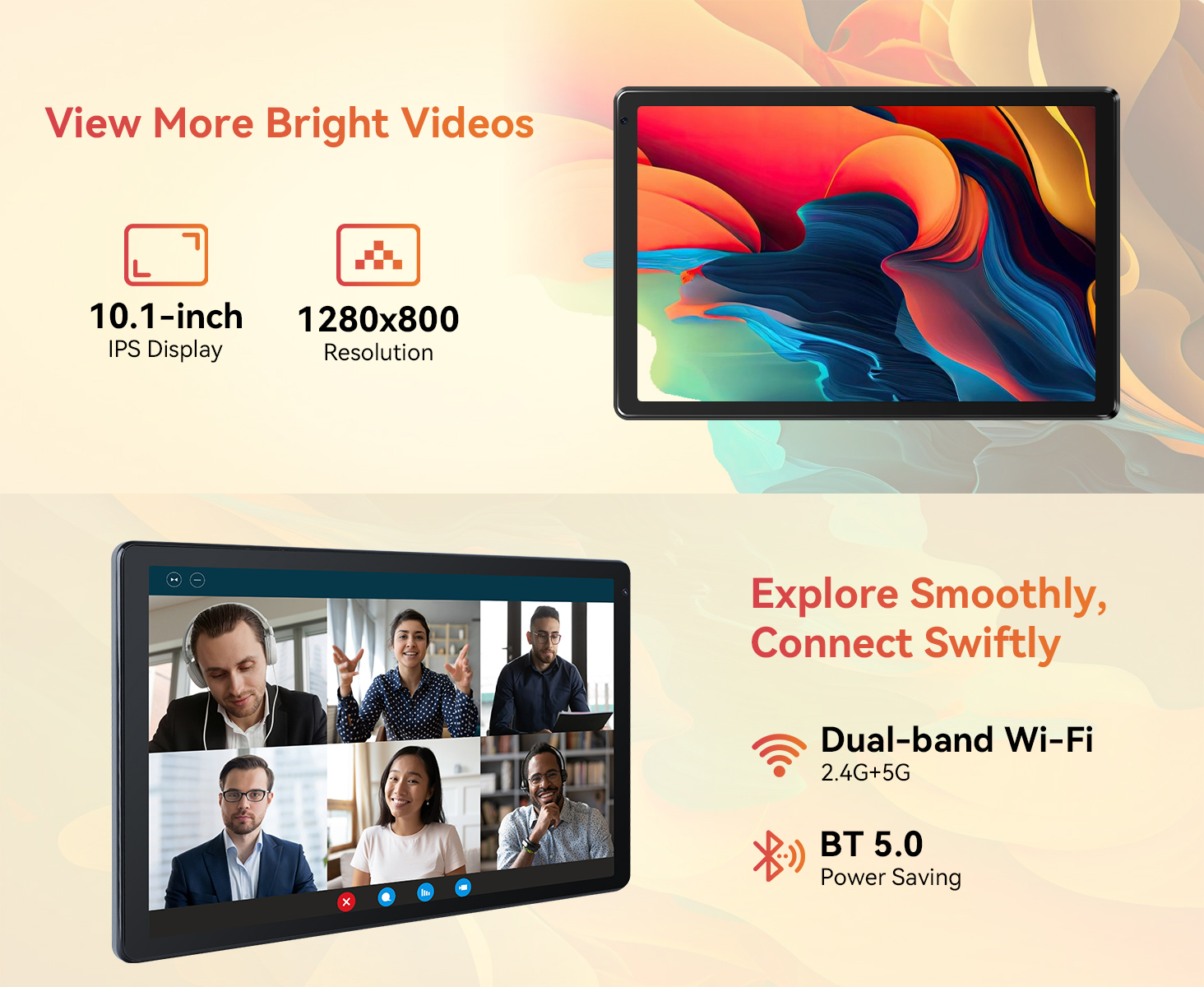 2,4G/5G dual-band WiFi säkerställer konstant anslutning, och surfplattan stöder även GPS och Bluetooth 5.0.